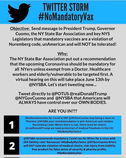 The New York State Bar Association (NYSBA) Health Section issued a report last week urging the State of New York to make covid 19 vaccines mandatory for all New Yorkers, with no religious or other personal belief exemptions. A vote will be held by the delegates of the bar association to accept the report during an online convention scheduled for June 13, the first anniversary of the repeal of the religious exemption in New York. No state or the federal government requires universal vaccination. And to date no medical associations have called for universal use of the still non-existent covid 19 vaccine.
